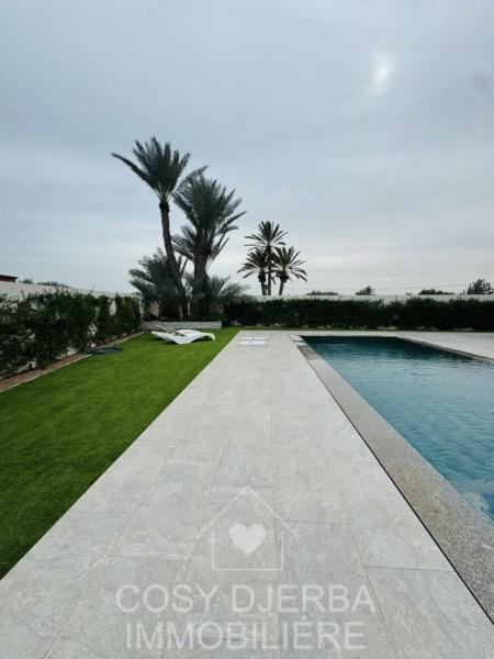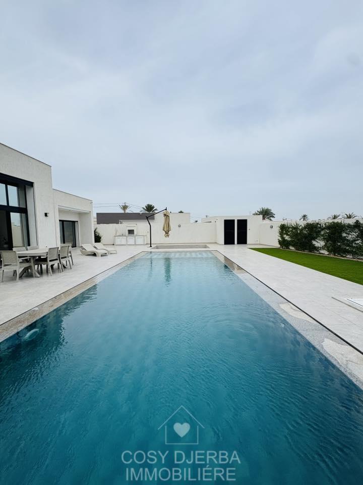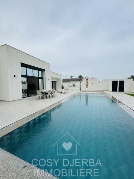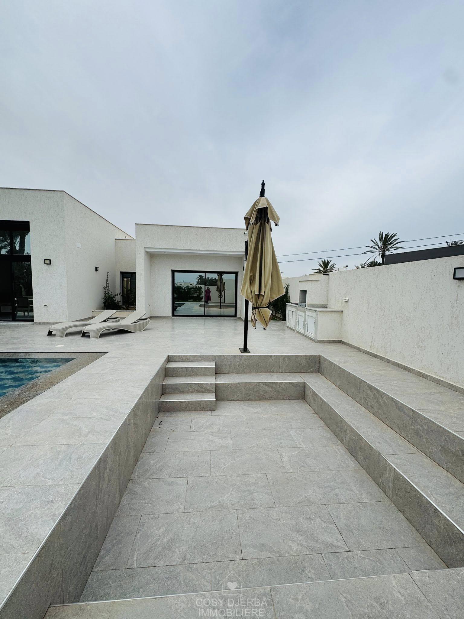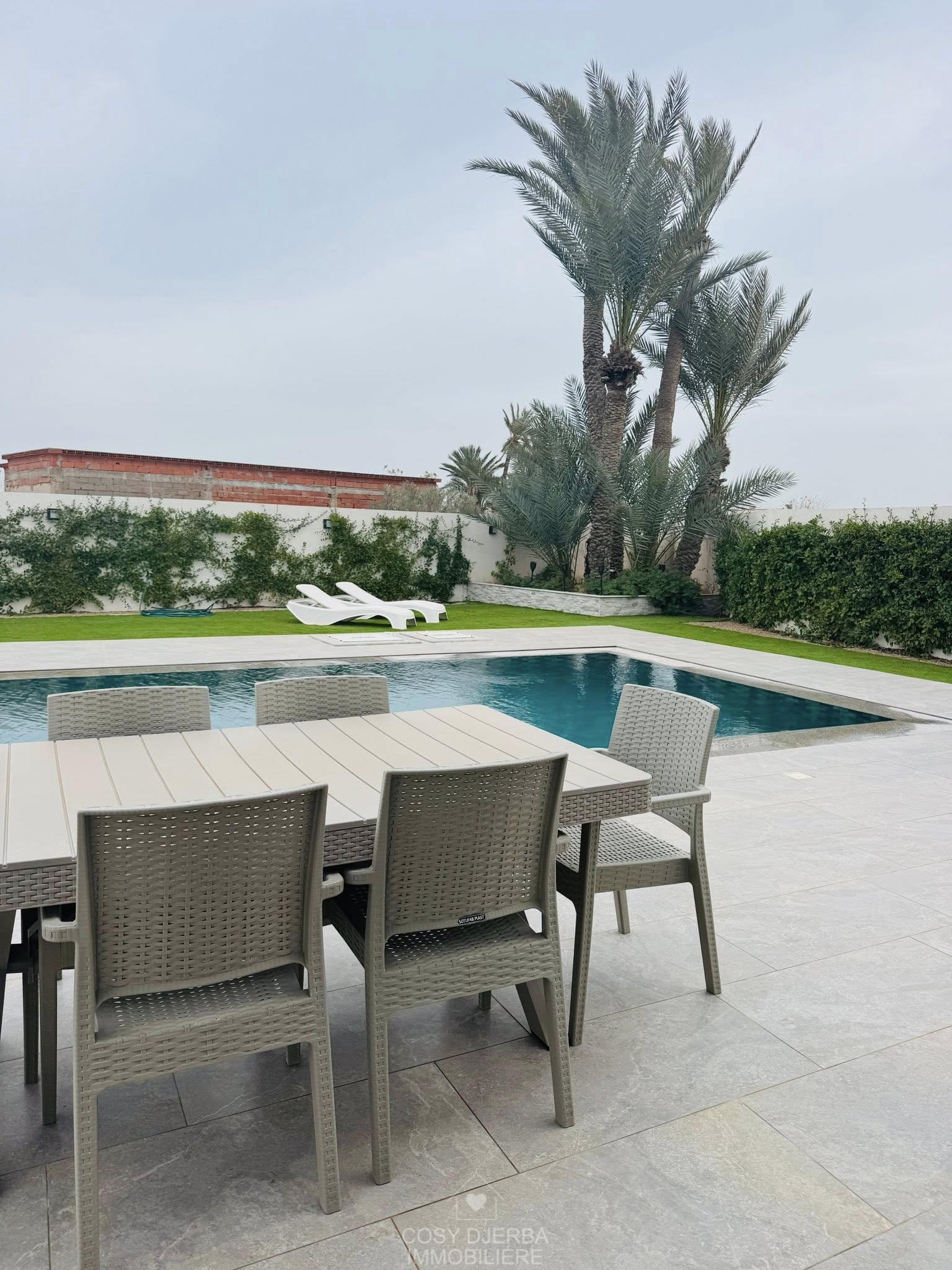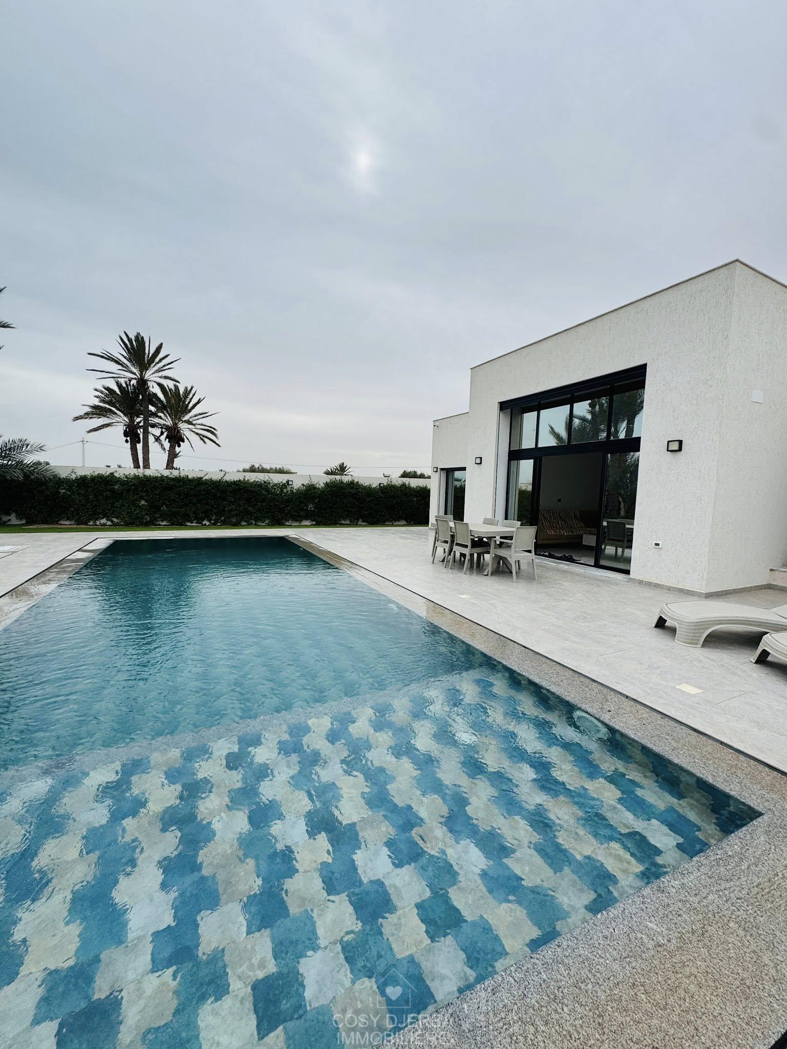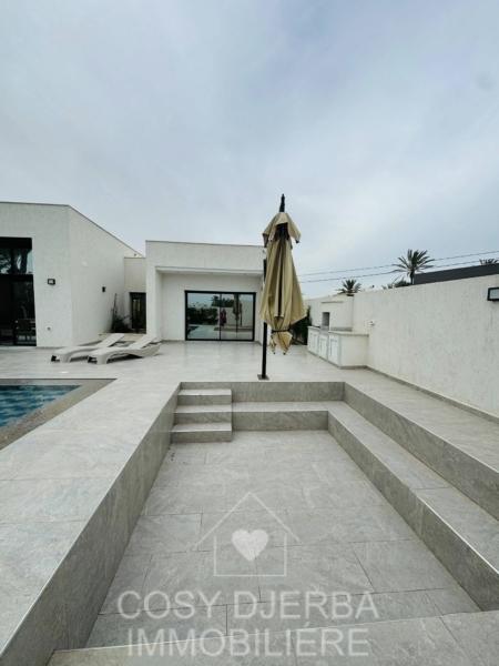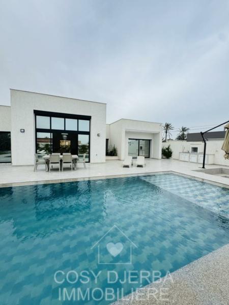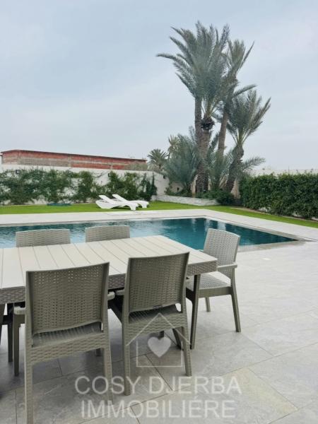 Cosy Djerba immobilier vous propose à la location annuelle cette superbe villa S4 moderne avec piscine, située à Tezdaine Djerba.