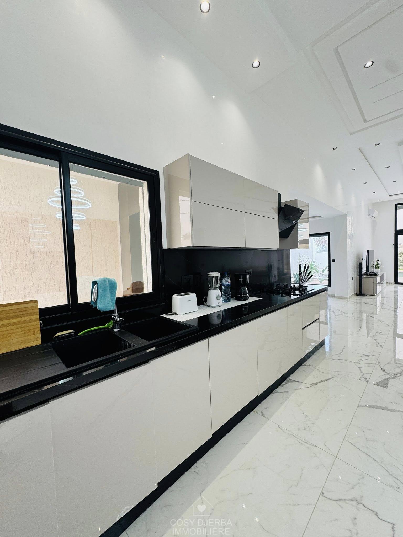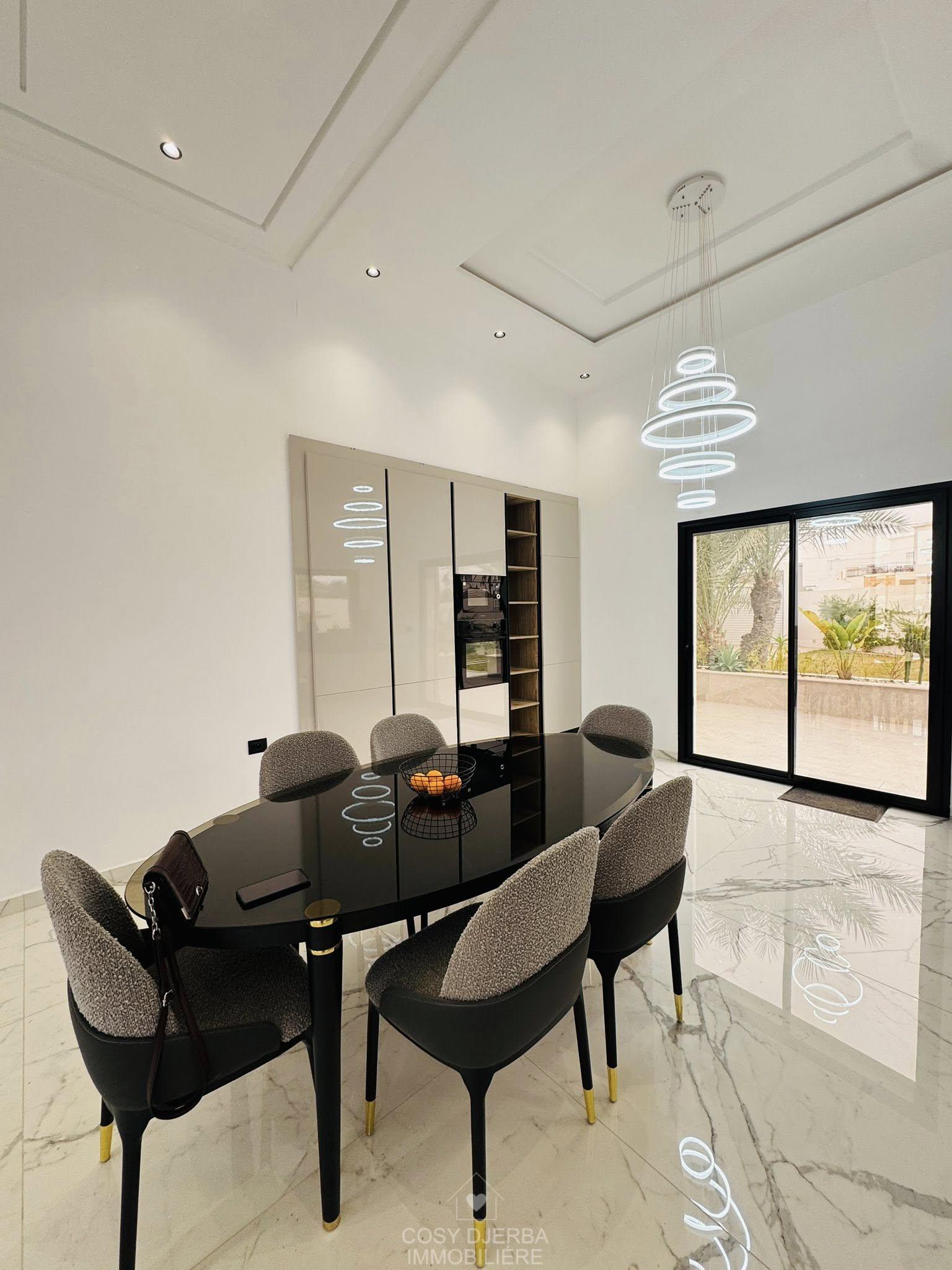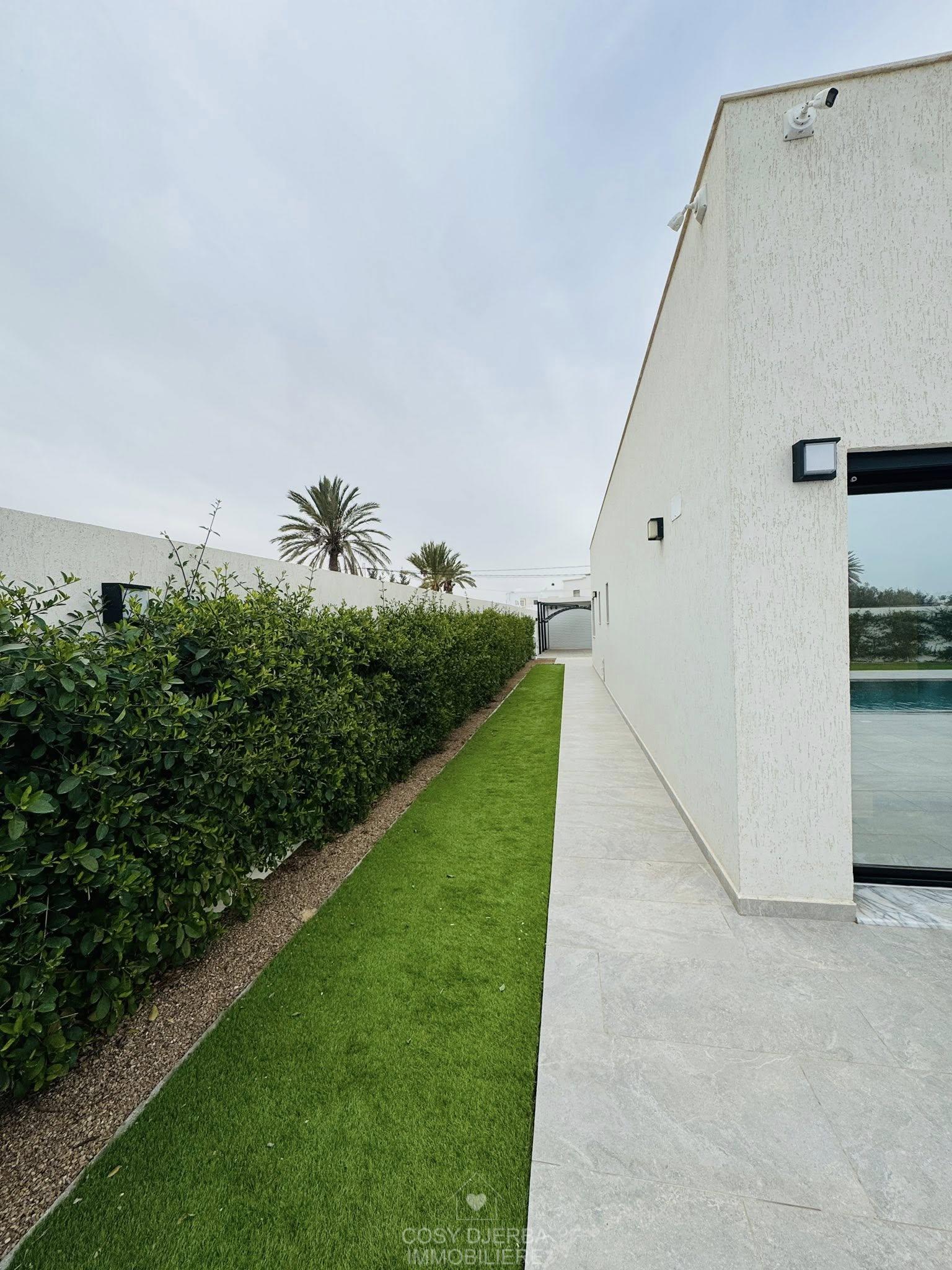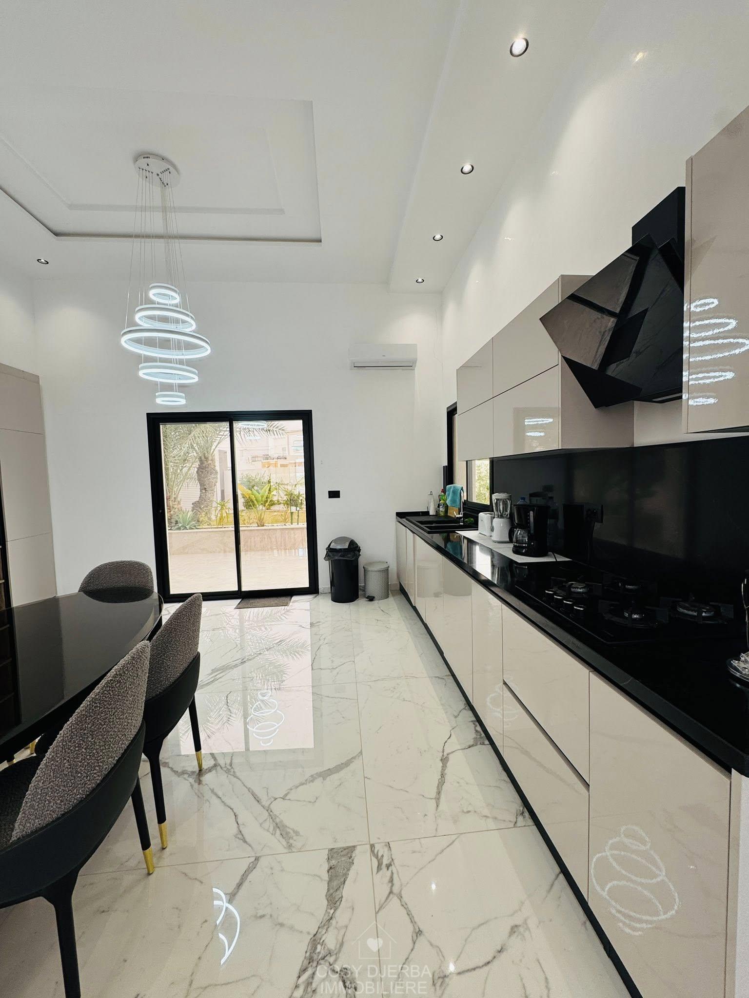 Cosy Djerba immobilier vous propose à la location annuelle cette superbe villa S4 moderne avec piscine, située à Tezdaine Djerba.