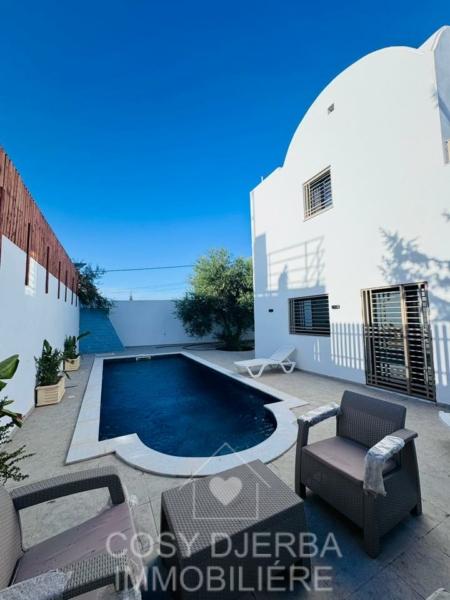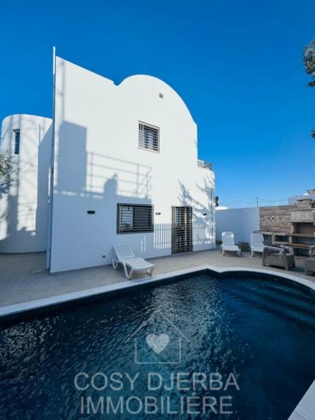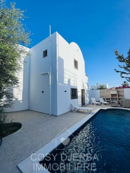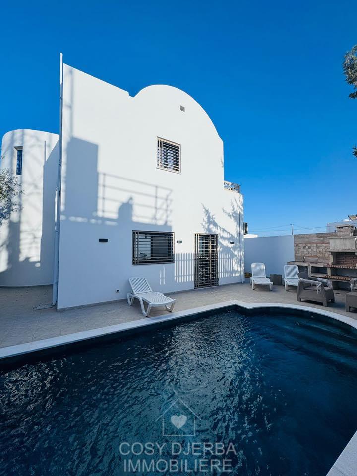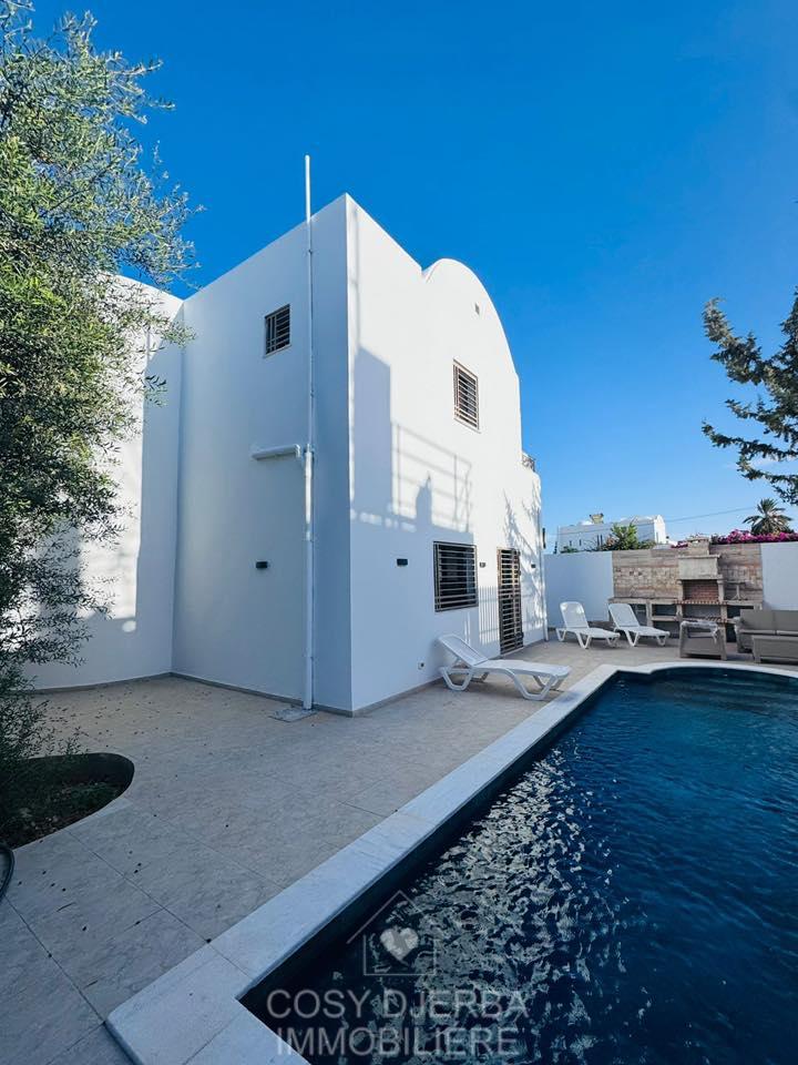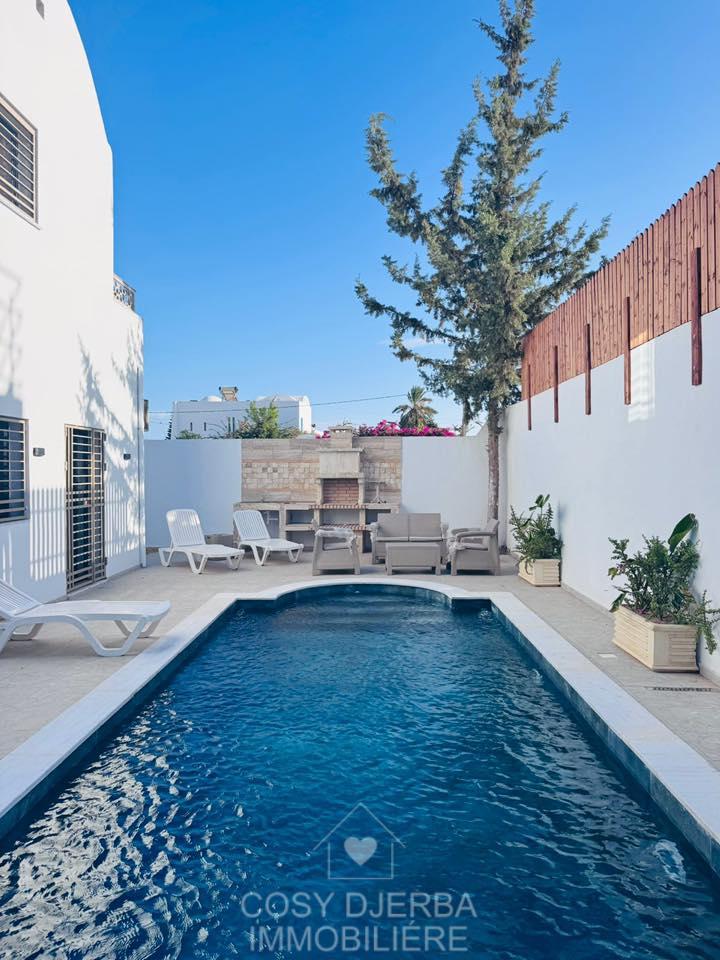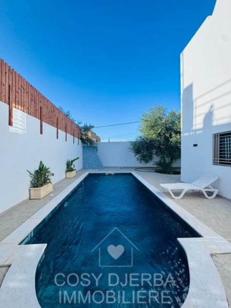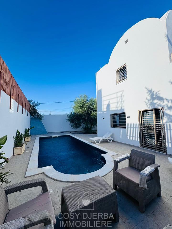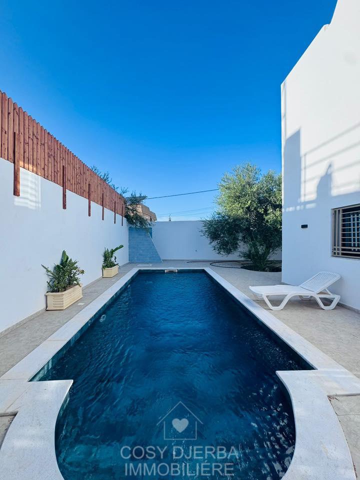 Cosy Djerba immobilier vous propose à la location annuelle cette superbe villa moderne avec piscine, située à Midoun Djerba.